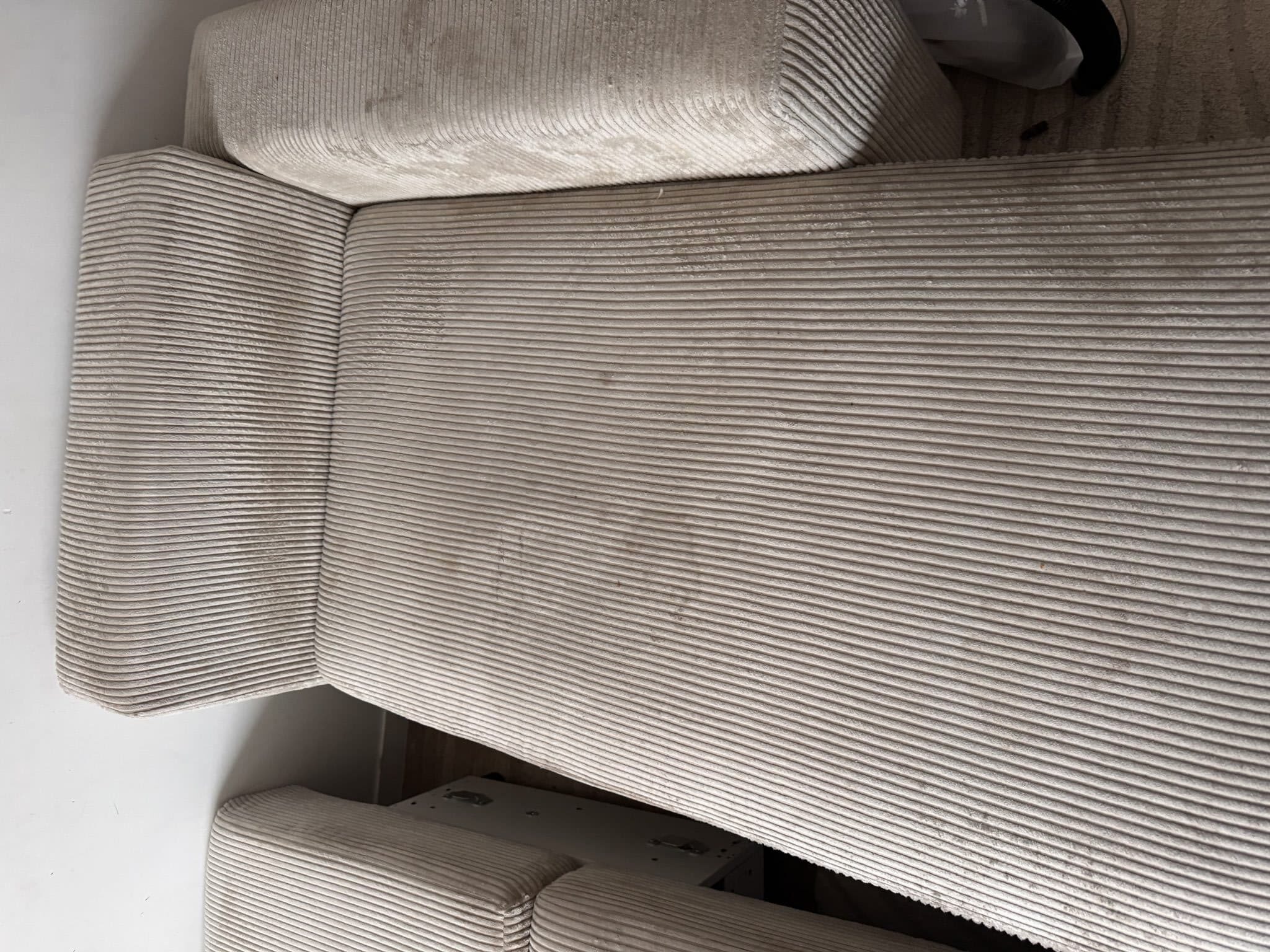 Un tissu clair, c’est élégant… mais ça marque vite : poussière, traces d’usage, auréoles et zones plus ternes sur l’assise et les accoudoirs.