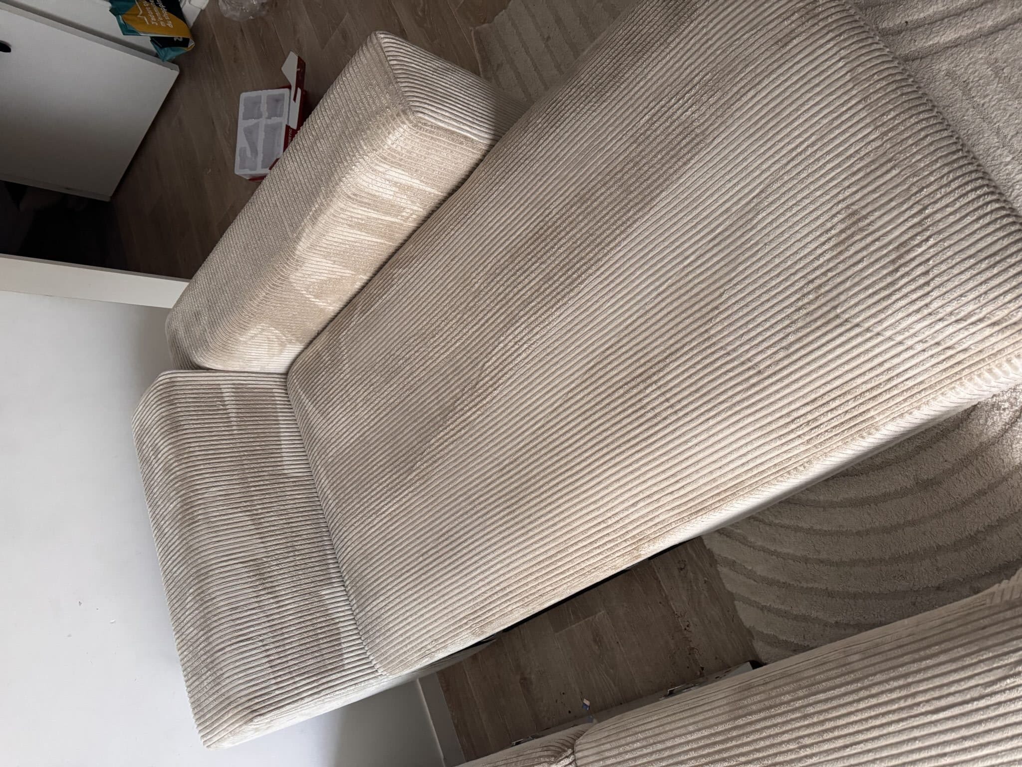 Réalisation La Carpetia : Nettoyage d’une chauffeuse en velours côtelé (avant / après)
